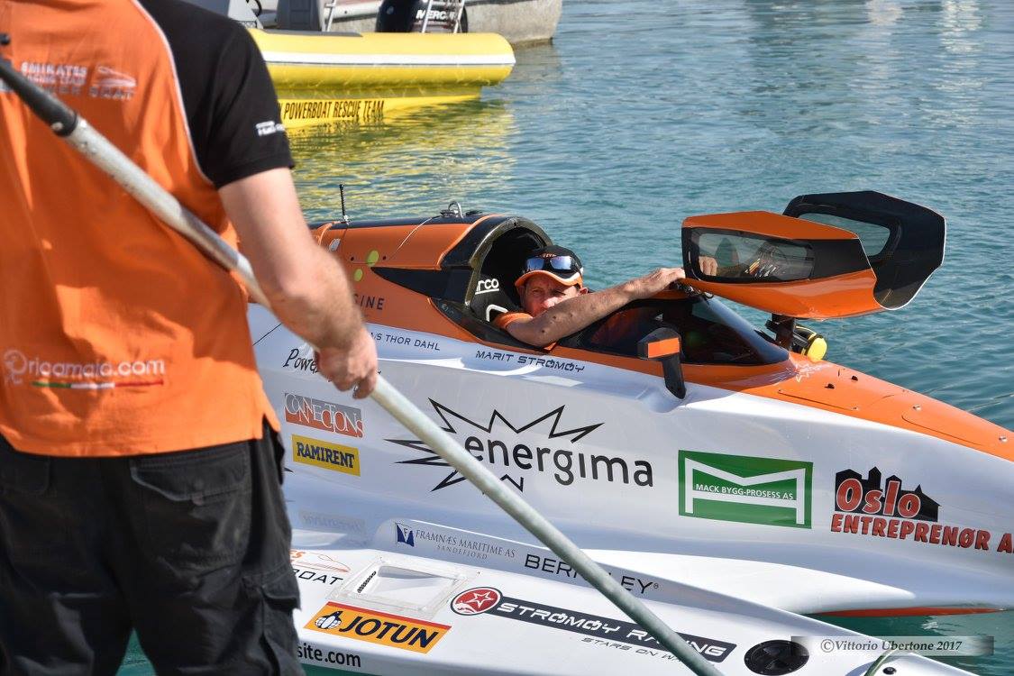 The team went out in the start of the session, but came up after about 10 minutes to change engine. After about 15 minutes Marit was back in the water and started testing propellers. She pushed down the laptimes little by little and posted her best time in the very last lap of the free practice. The boat balanced nicely on the water. - I'm quite happy with today's performance. We are so far in a very safe engine set up since it's only free practice and will push a bit harder tomorrow, says Marit from the pit in Abu Dhabi.