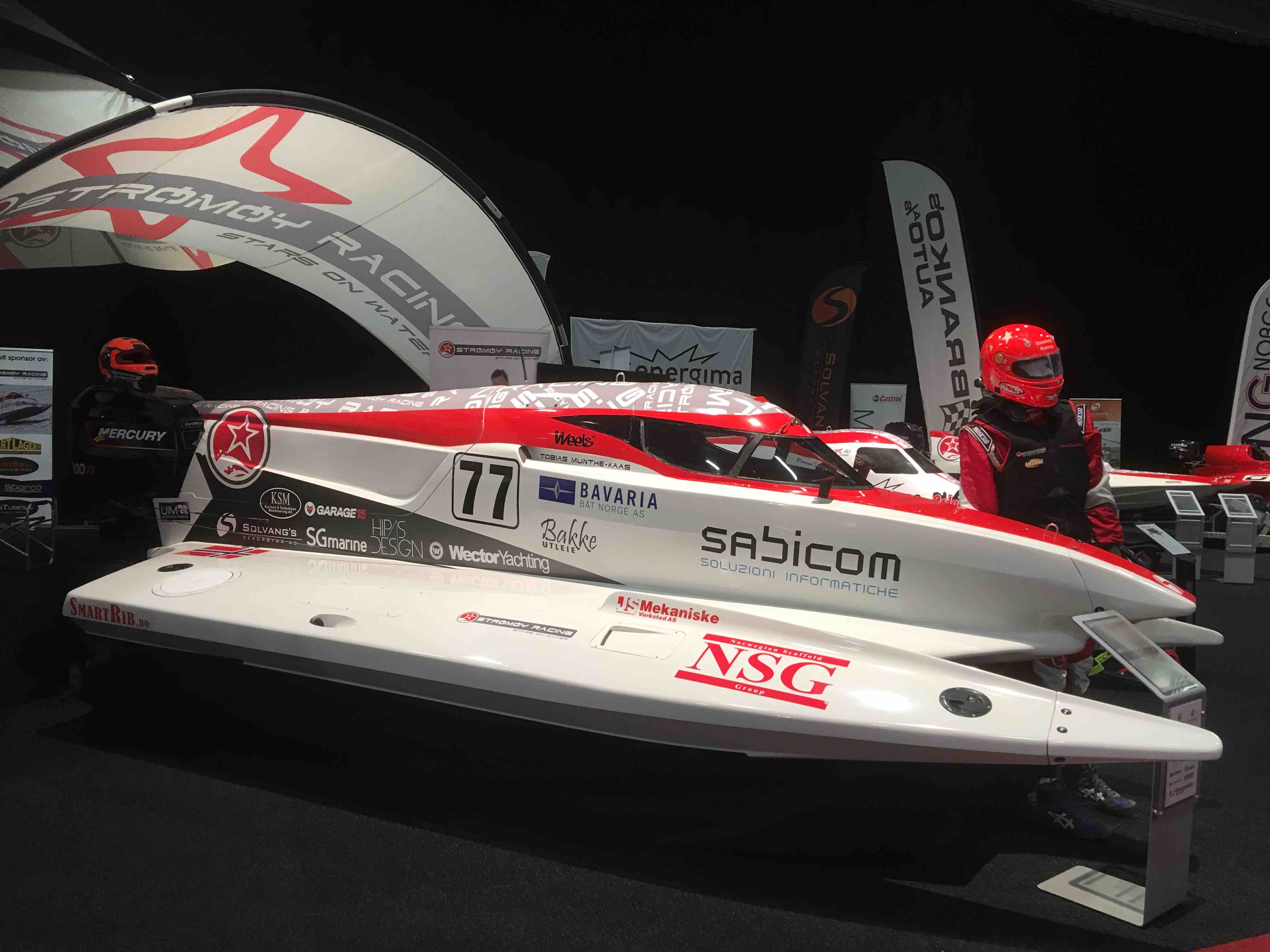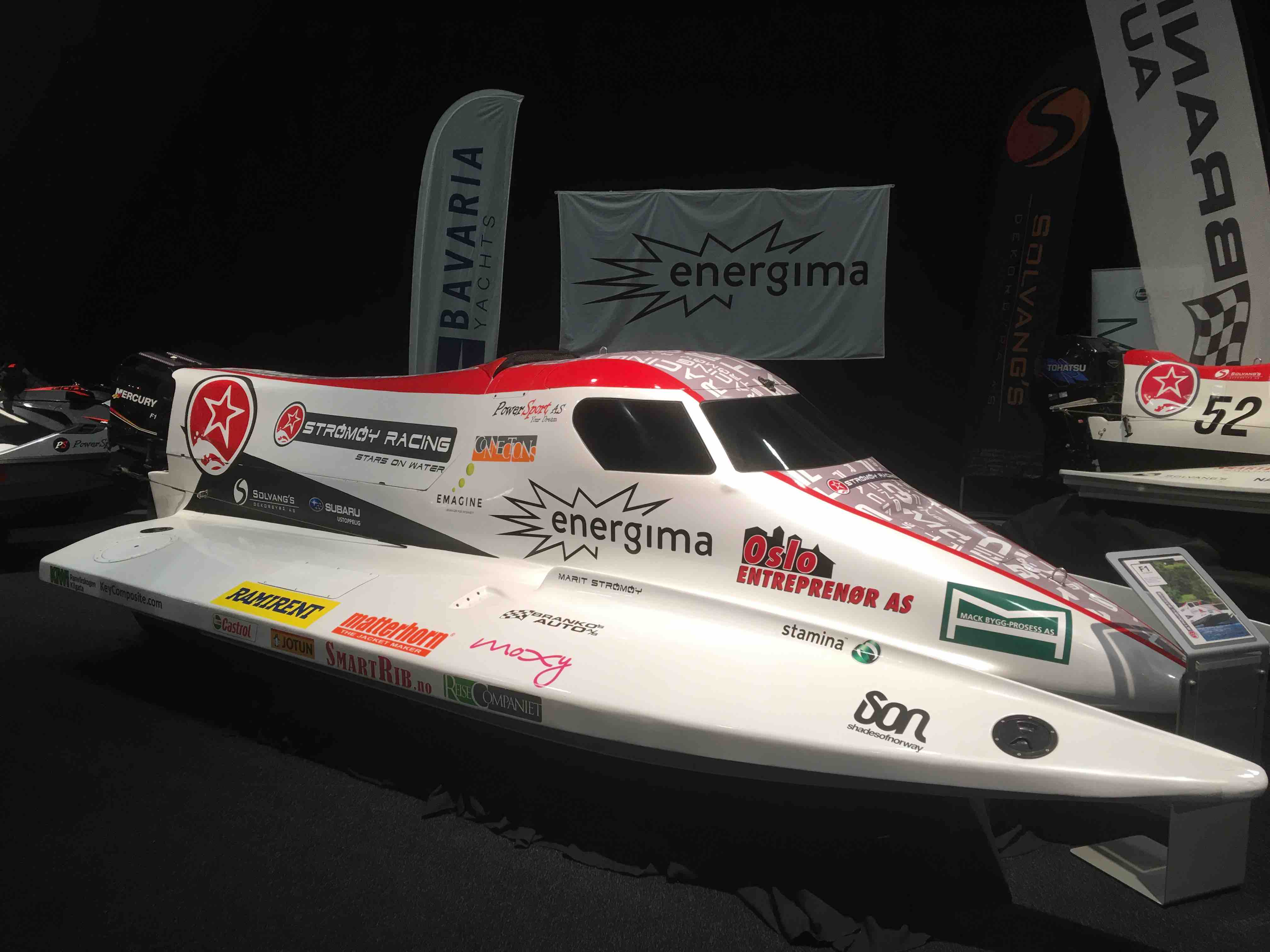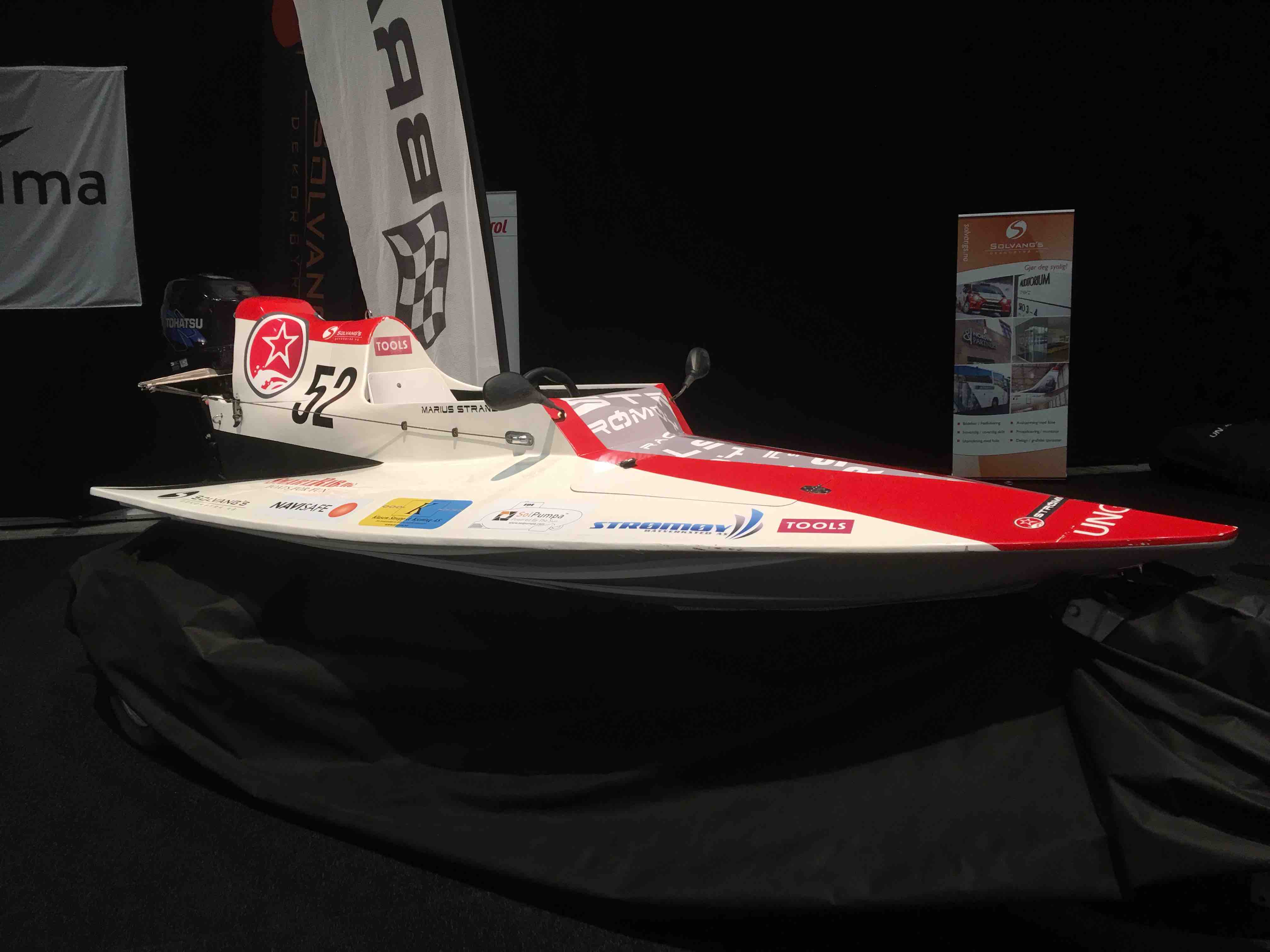 The GT30 boat of Marius Strand is at the exhtibition powered by Live S. Gulbrandsen's engine. They will both compete in GT30 and while one is waiting for a new boat, the other is waiting for the engine.